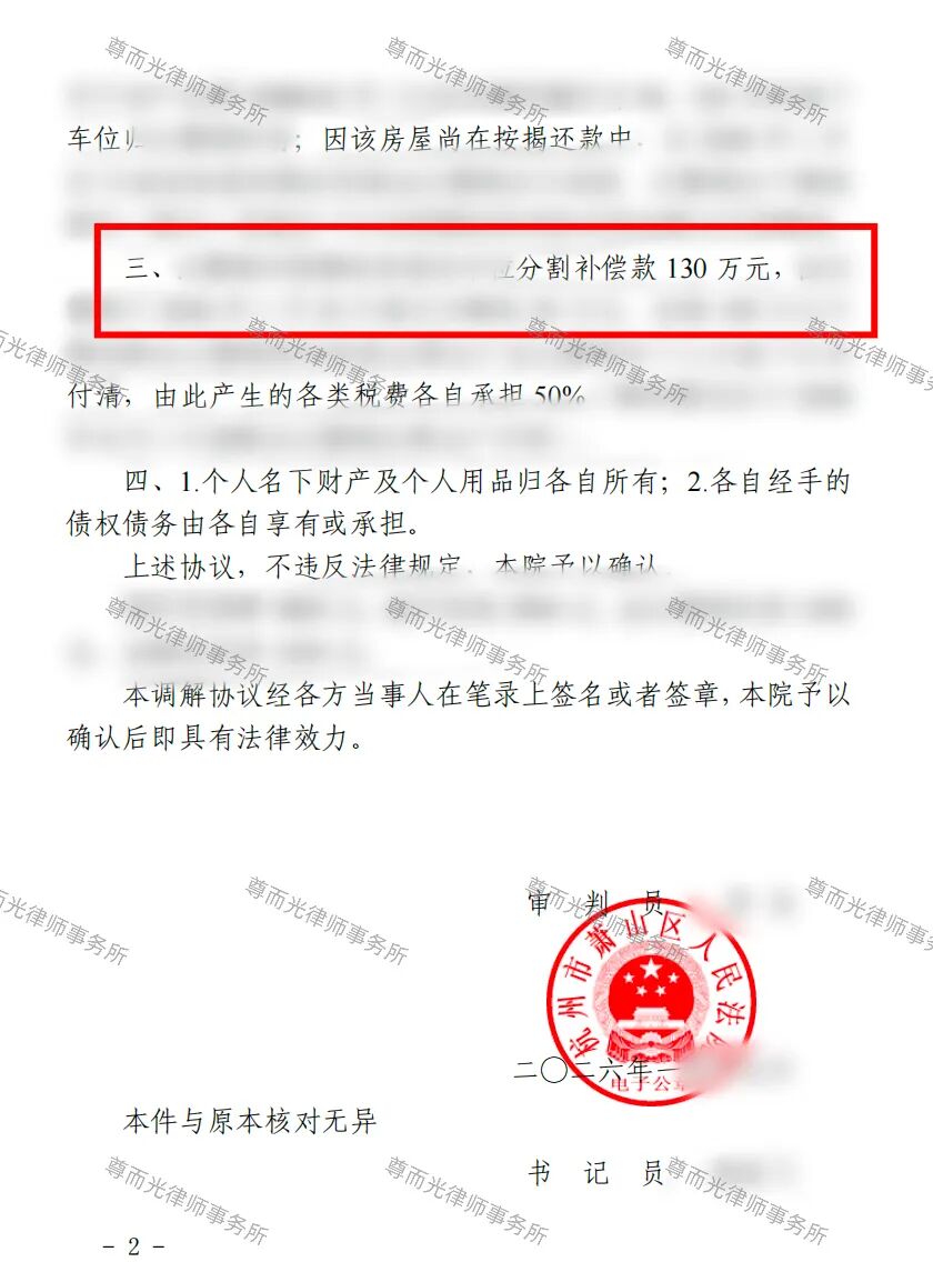 张某成功获得130万元现金补偿,同时调解书明确房屋及车位归女方所有,将未来不可控的房产贬值风险与持续的还贷压力完全转移,远高于最初“仅分得30-40万且承担风险”的预期。