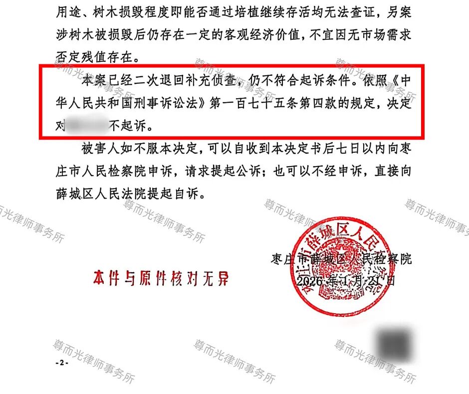 结合树木残值核算,损失金额很可能未达到故意毁坏财物罪 5000 元的入罪标准,案件定罪的基础并不成立。