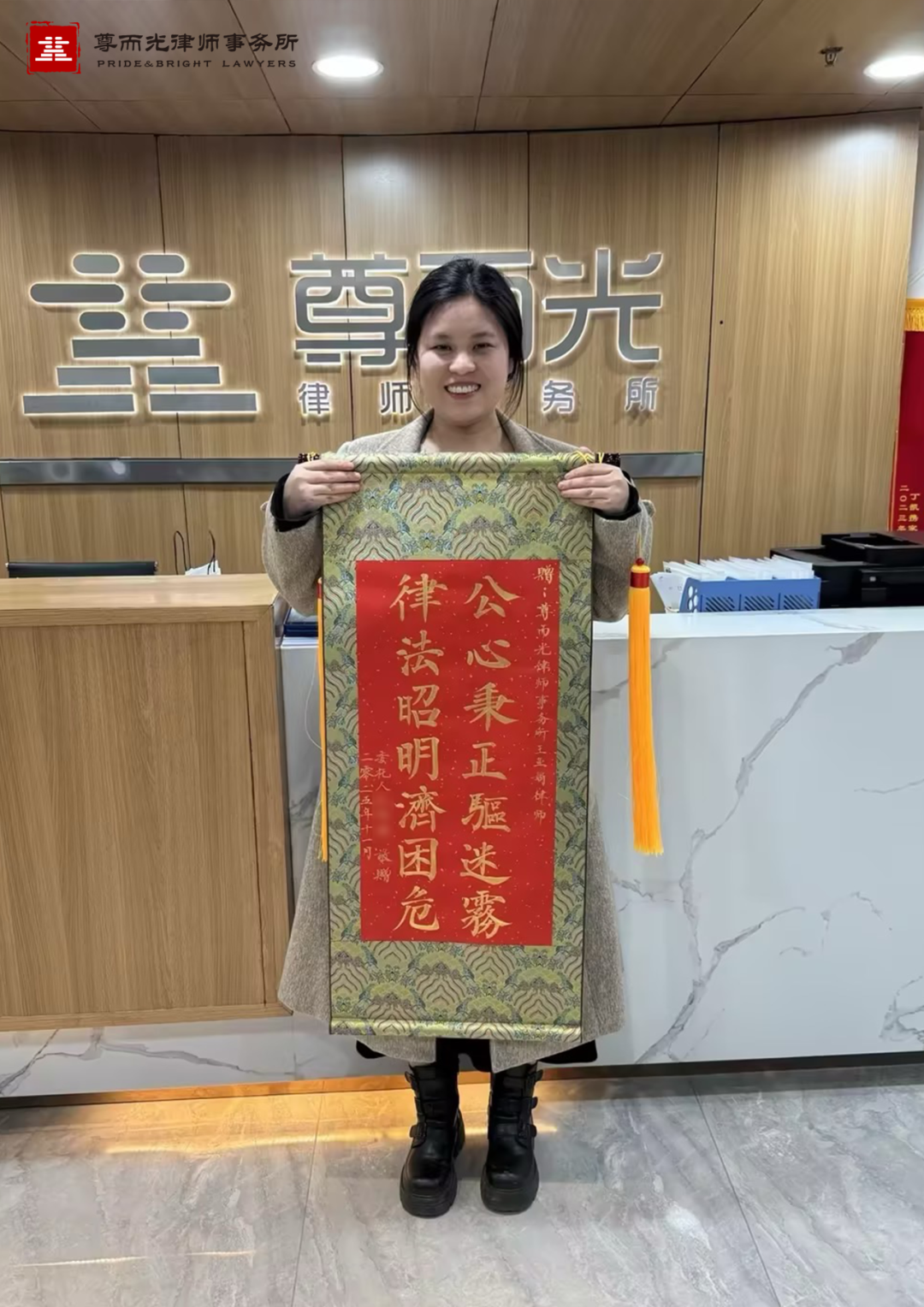 【获赠评语】正道昭彰沐光暖,良律智援解君忧;公心秉正驱迷雾,律法昭明济困危。